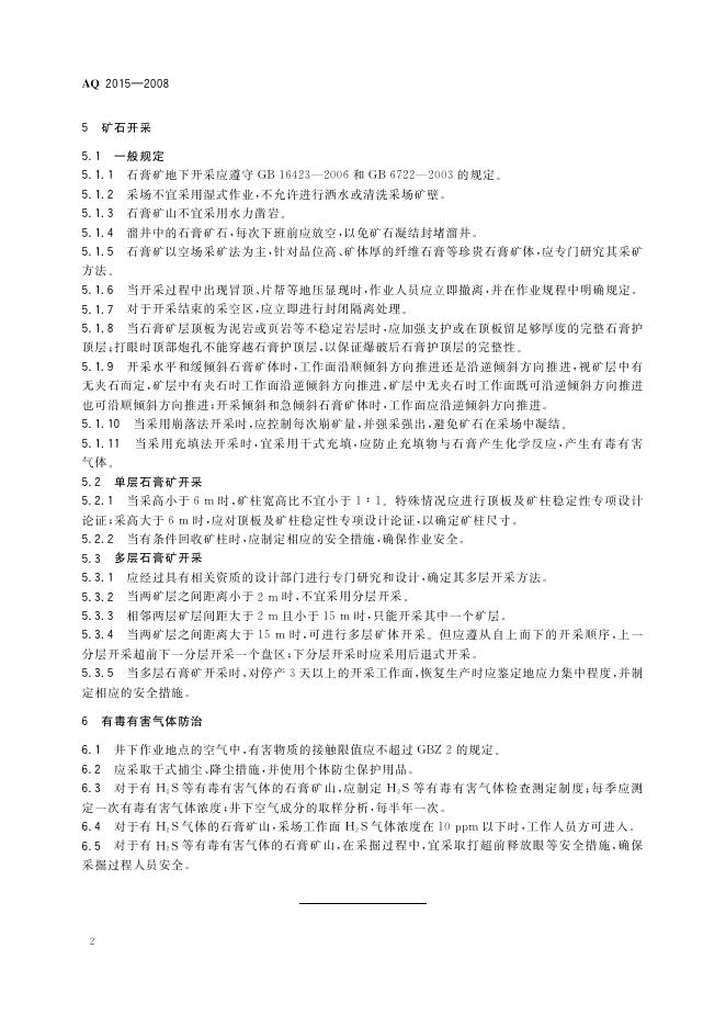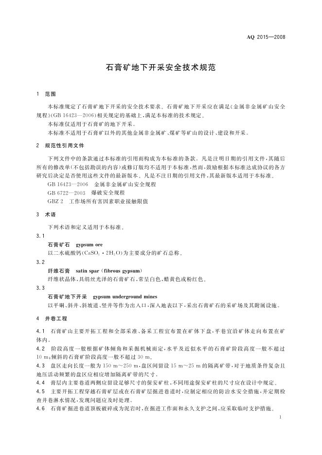 AQ 2015-2008 石膏矿地下开采安全技术规范