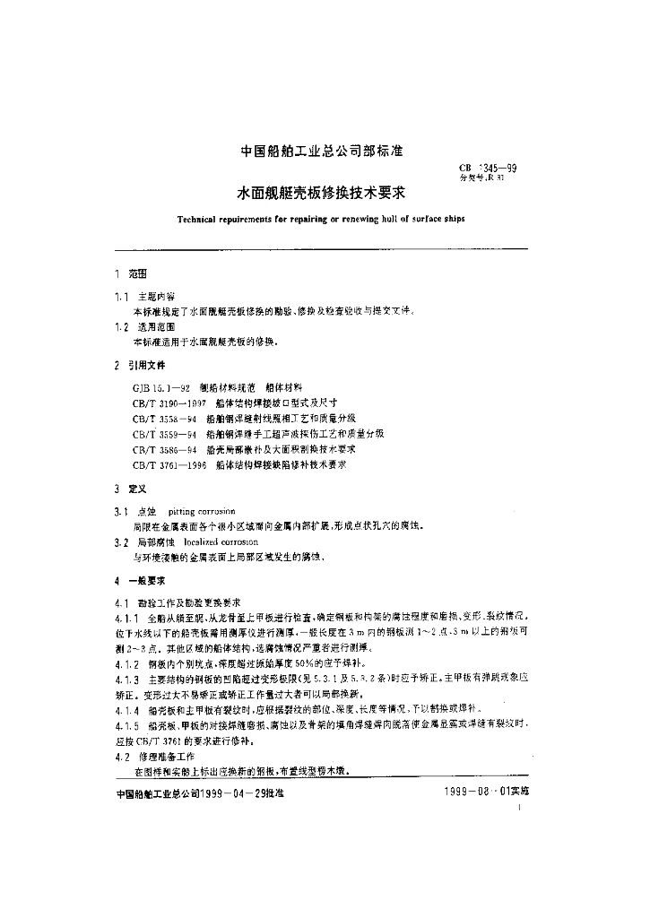CB 1345-1999 水面舰艇壳板修换技术要求