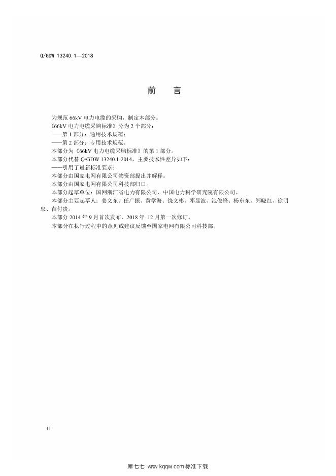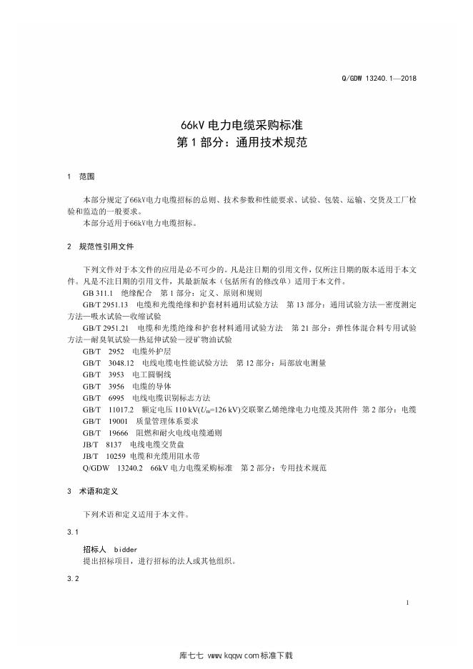 Q/GDW 13240.1-2018 66kV电力电缆采购标准 第1部分:通用技术规范