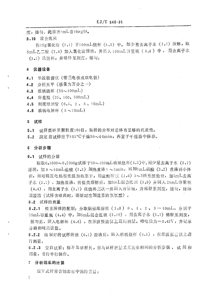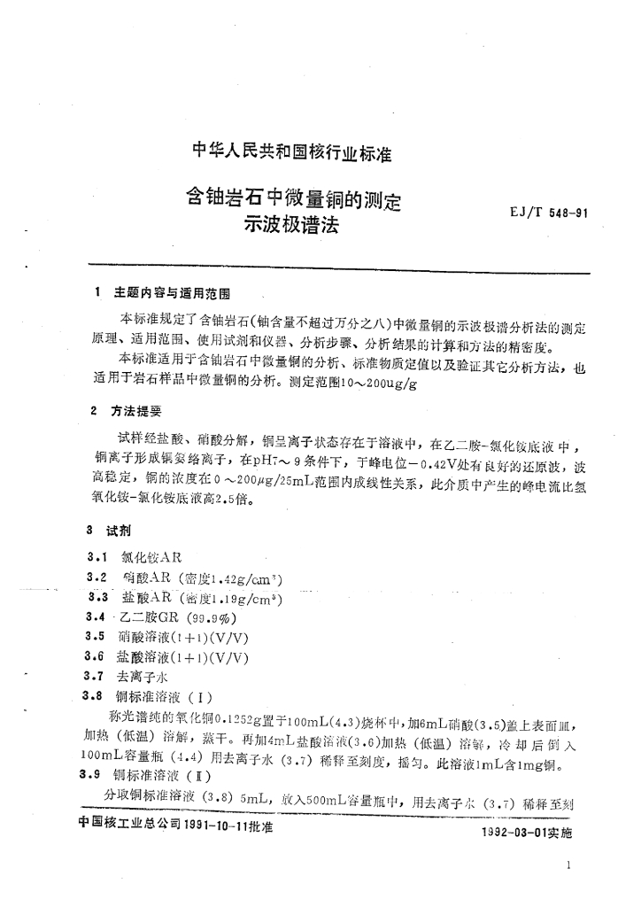 EJ/T 548-1991 含铀岩石中微量铜的测定示波极谱法