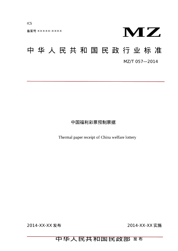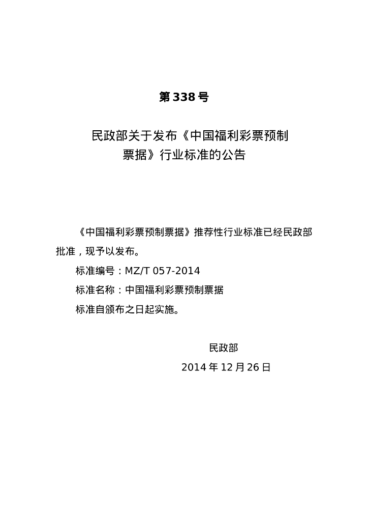 MZ/T 057-2014 中国福利彩票预制票据