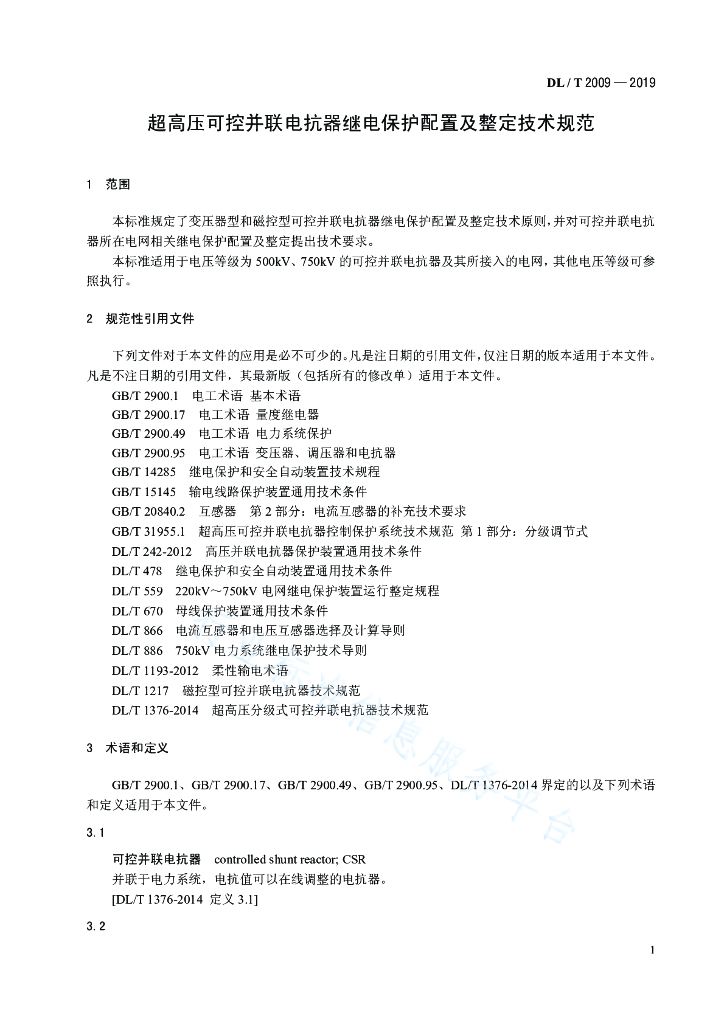 DL/T 2009-2019 超高压可控并联电抗器继电保护配置及整定技术规范