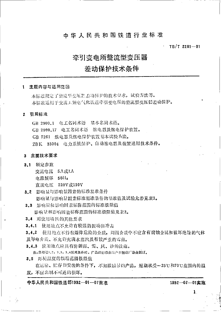 TB/T 2281-1991 牵引变电所整流型变压器差动保护技术条件