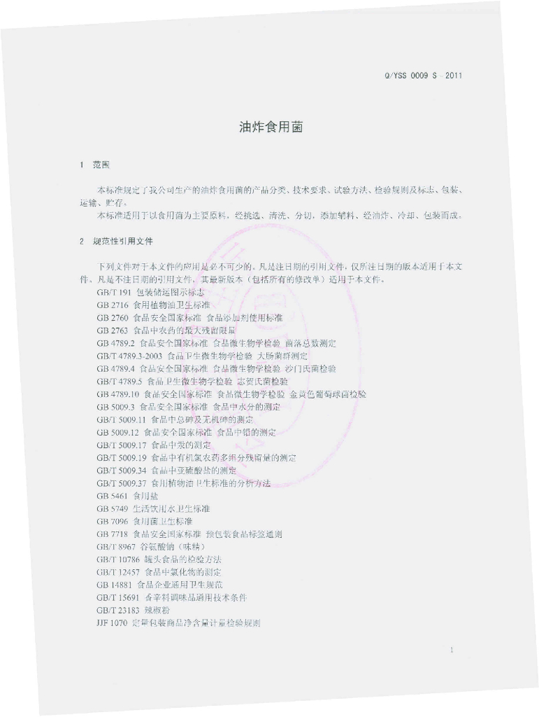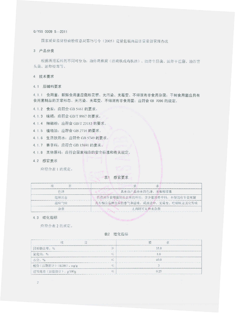 Q/YSS 0009S-2011 油炸食用菌