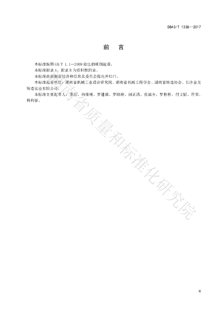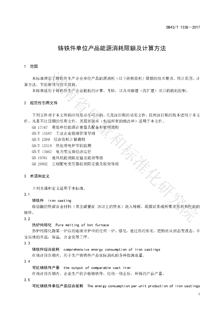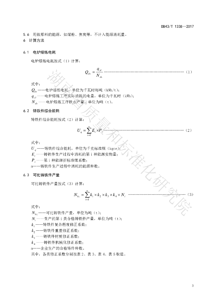DB43/T 1338-2017 铸铁件单位产品单位产品能源消耗限额及计算方法