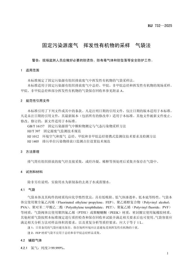 HJ 732-2025 固定污染源废气 挥发性有机物的采样 气袋法