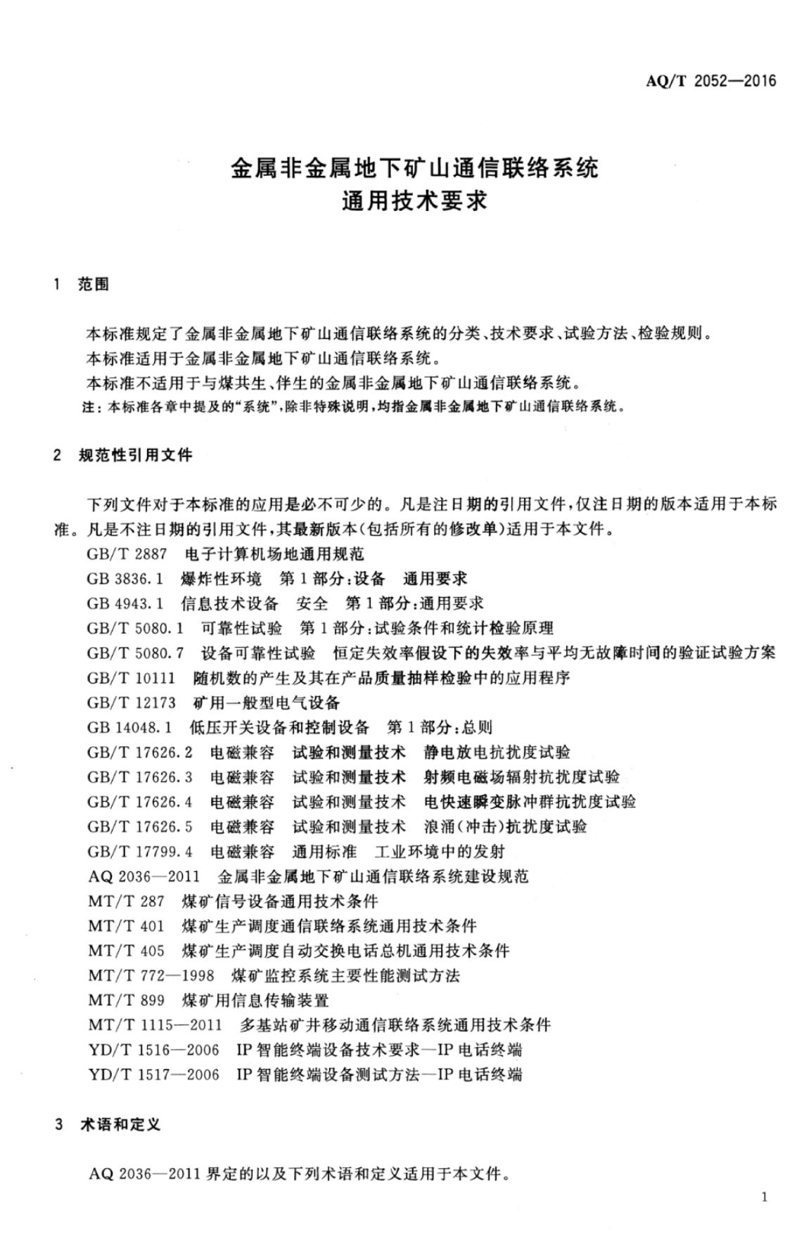 AQ/T 2052-2016 金属非金属地下矿山通信联络系统 通用技术要求