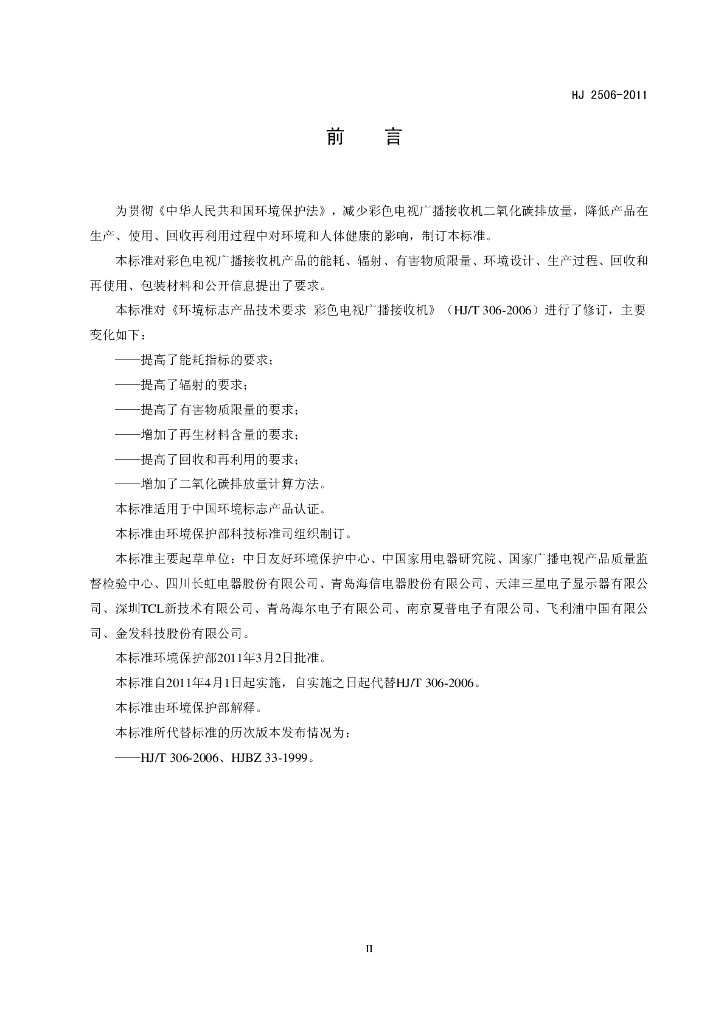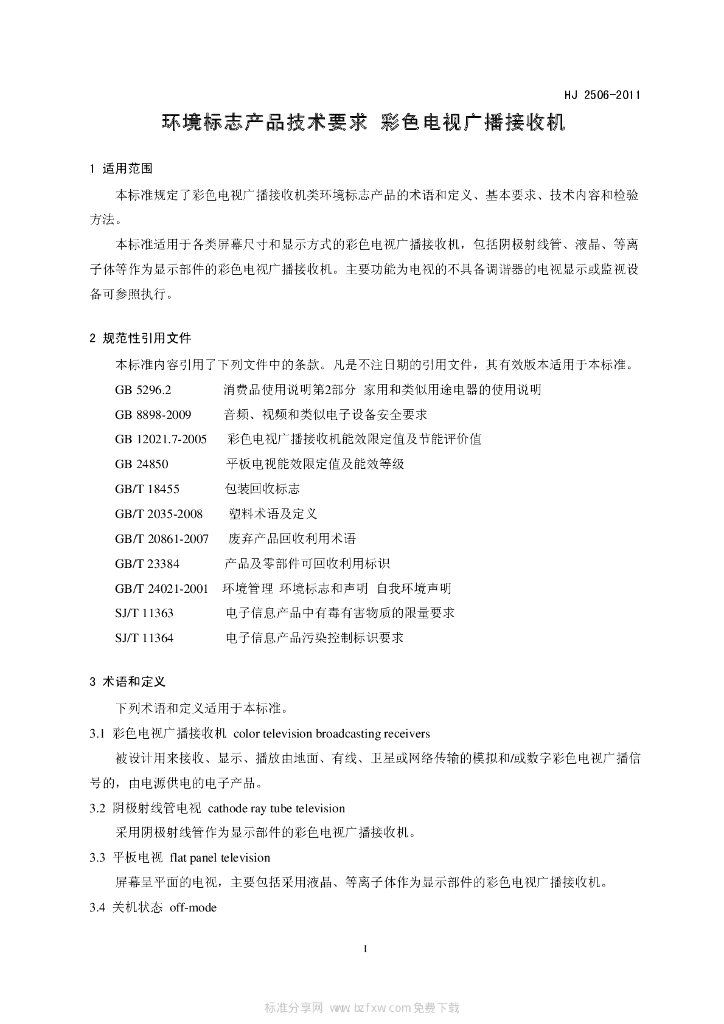 HJ 2506-2011 环境标志产品技术要求 彩色电视广播接收机