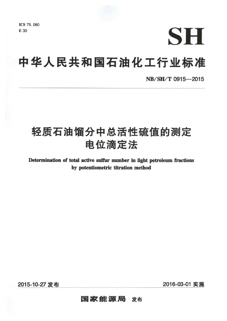 NB/SH/T 0915-2015 轻质石油馏分中总活性硫值的测定 电位滴定法