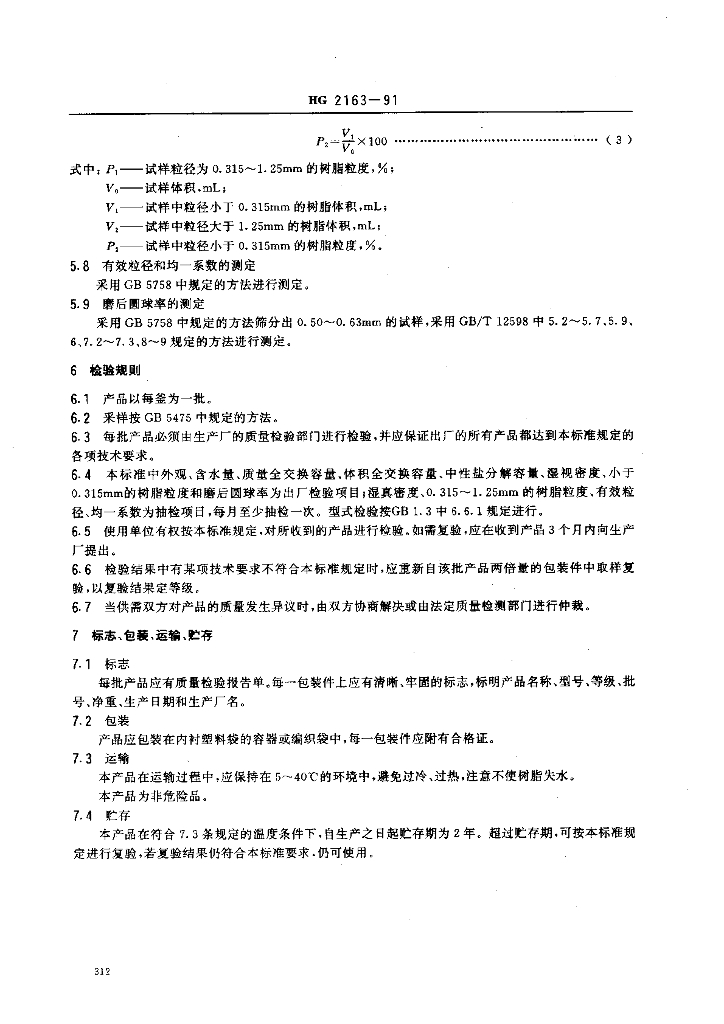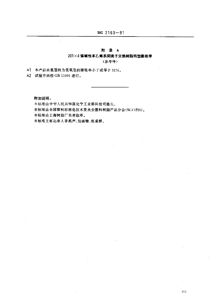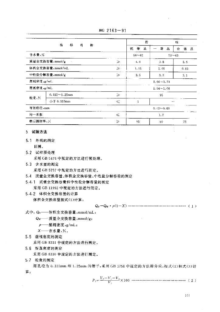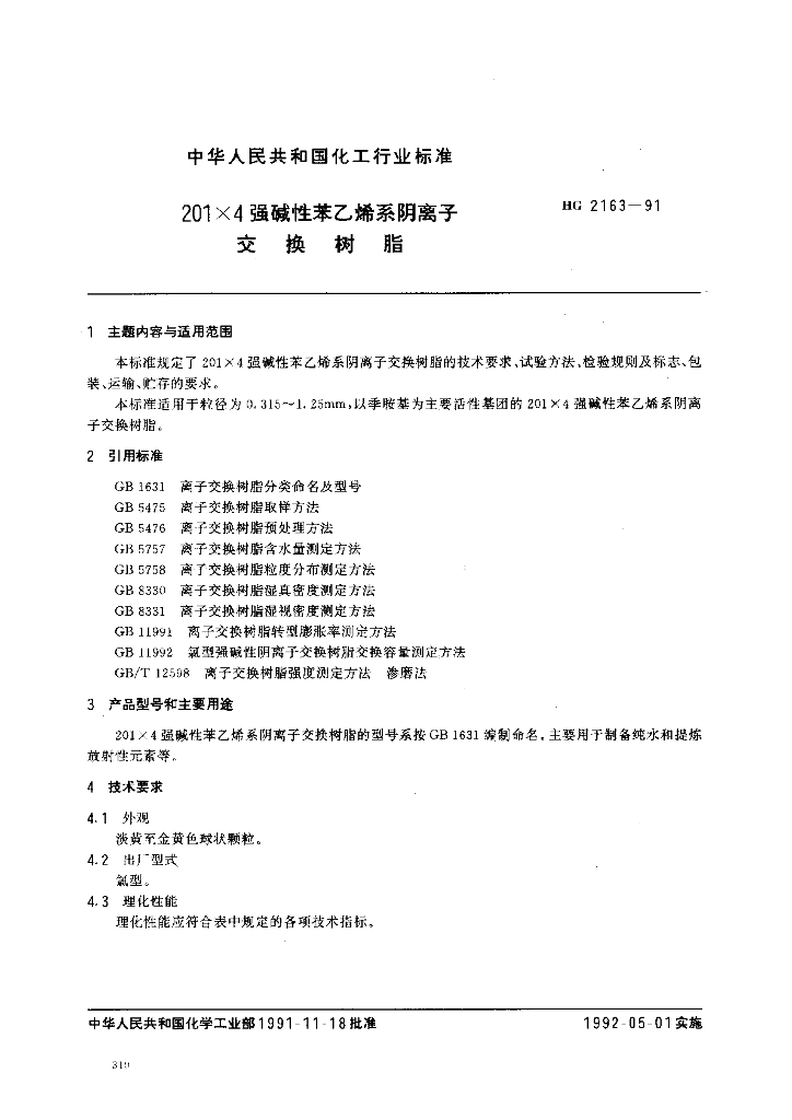 HG/T 2163-1991 201 X 4 强碱性苯乙烯系阴离子交换树脂