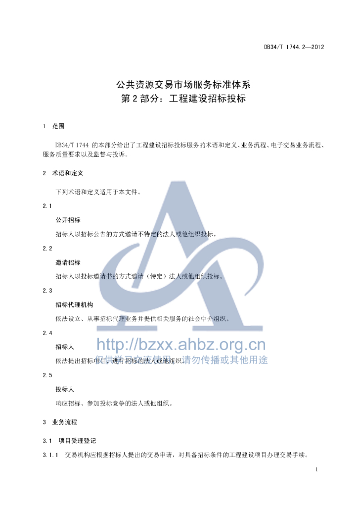 DB34/T 1744.2-2012 公共资源交易市场服务标准体系 第2部分:工程建设招标投标