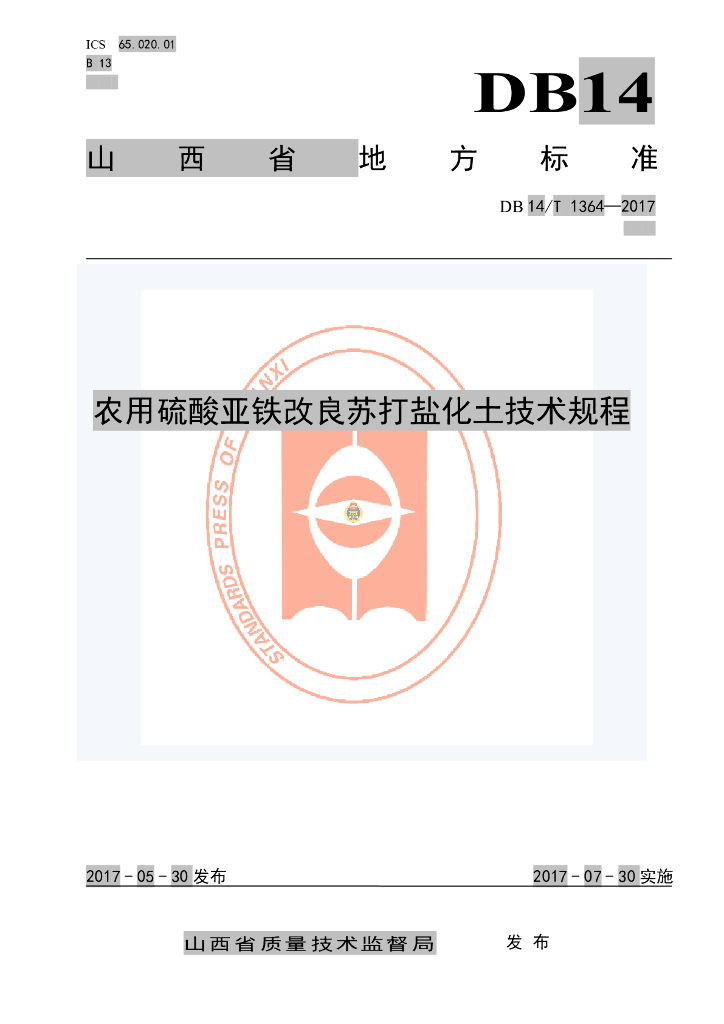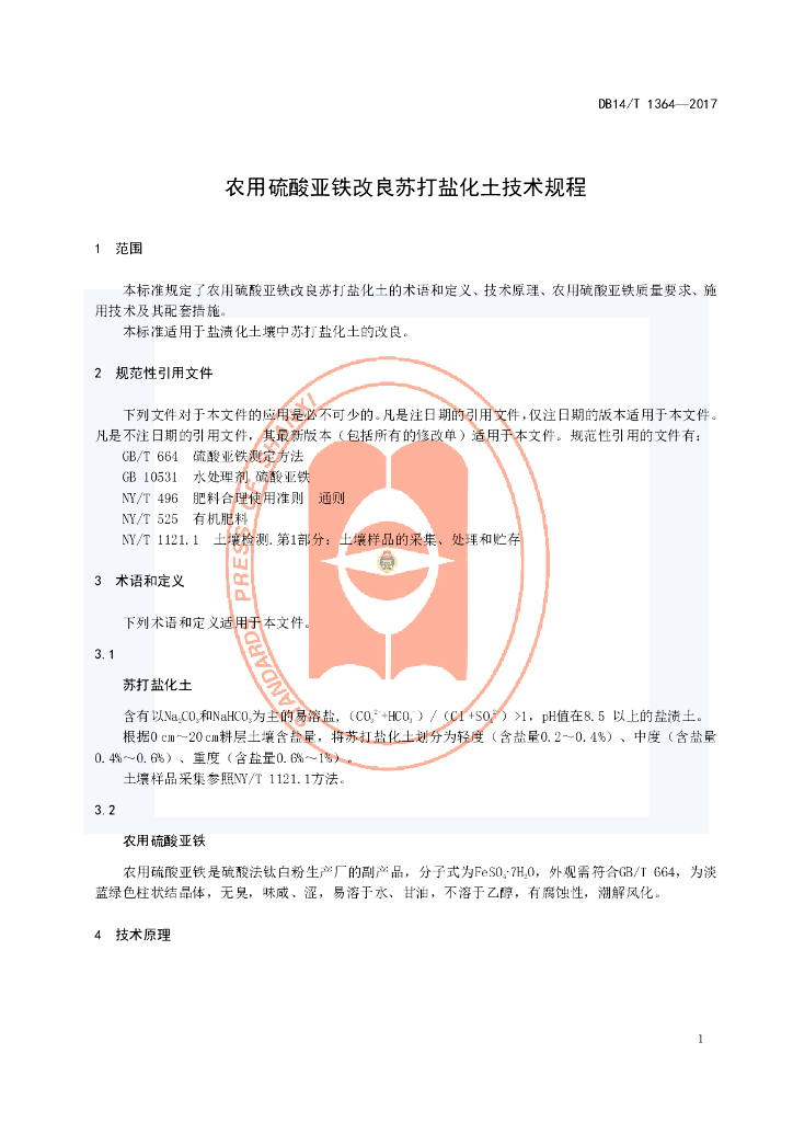 DB14/T 1364-2017 农用硫酸亚铁改良苏打盐化土技术规程
