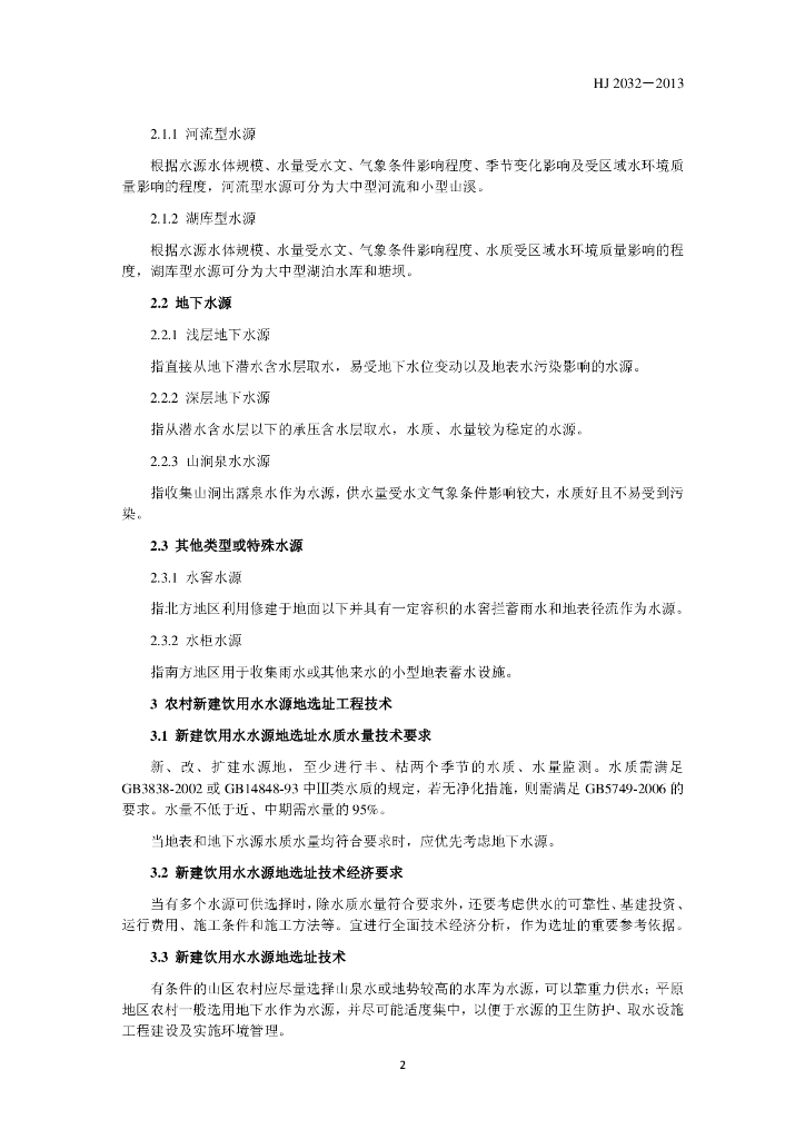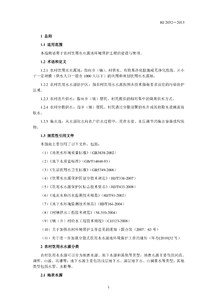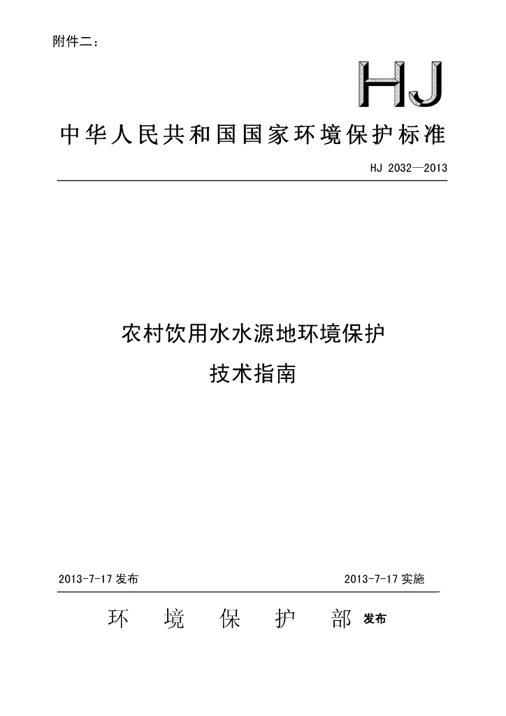 HJ 2032-2013 农村饮用水水源地环境保护 技术指南