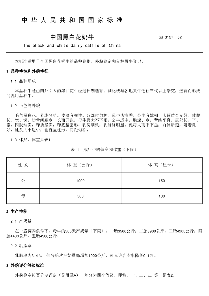 GB/T 3157-1982 中国黑白花奶牛