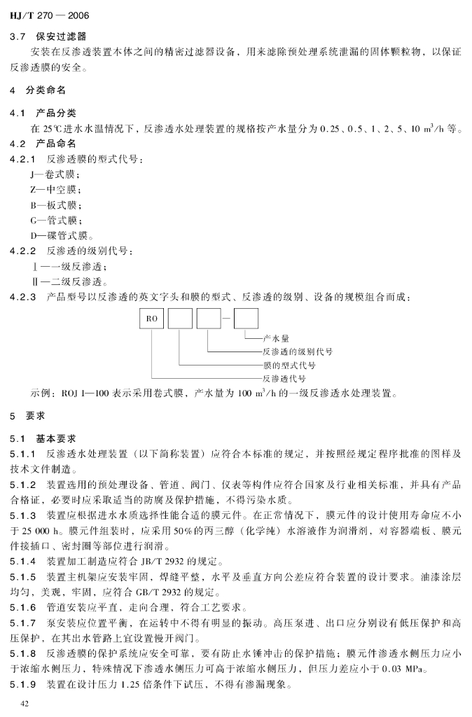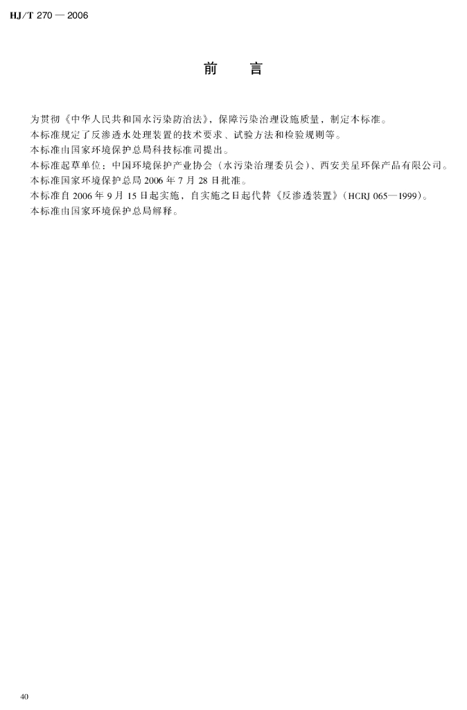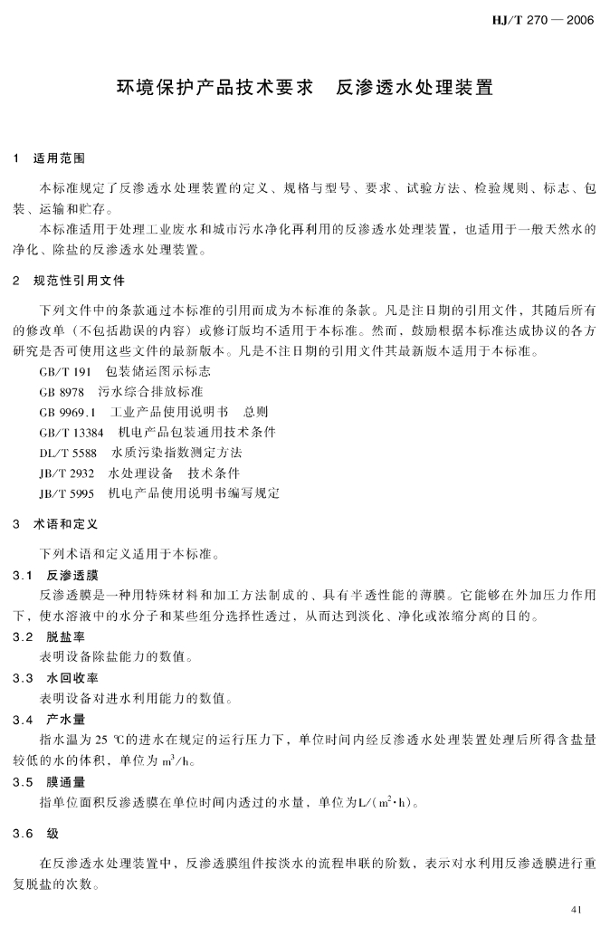 HJ/T 270-2006 环境保护产品技术要求 反渗透水处理装置