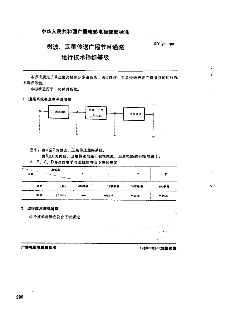 GY 71-1989 微波、卫星传送广播节目通路运行技术指标等级