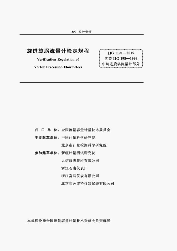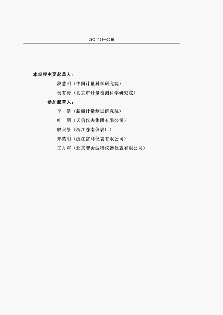 段慧明(中国计量科学研究院)、杨有涛(北京市计量检测科学研究院)、李浩(新疆计量测试研究院)、叶朋(天信仪表集团有限公司)、殷兴景(浙江苍南仪表厂)、郑英明(浙江富马仪表有限公司)、王月声(北京菲舍波特仪器仪表有限公司)
