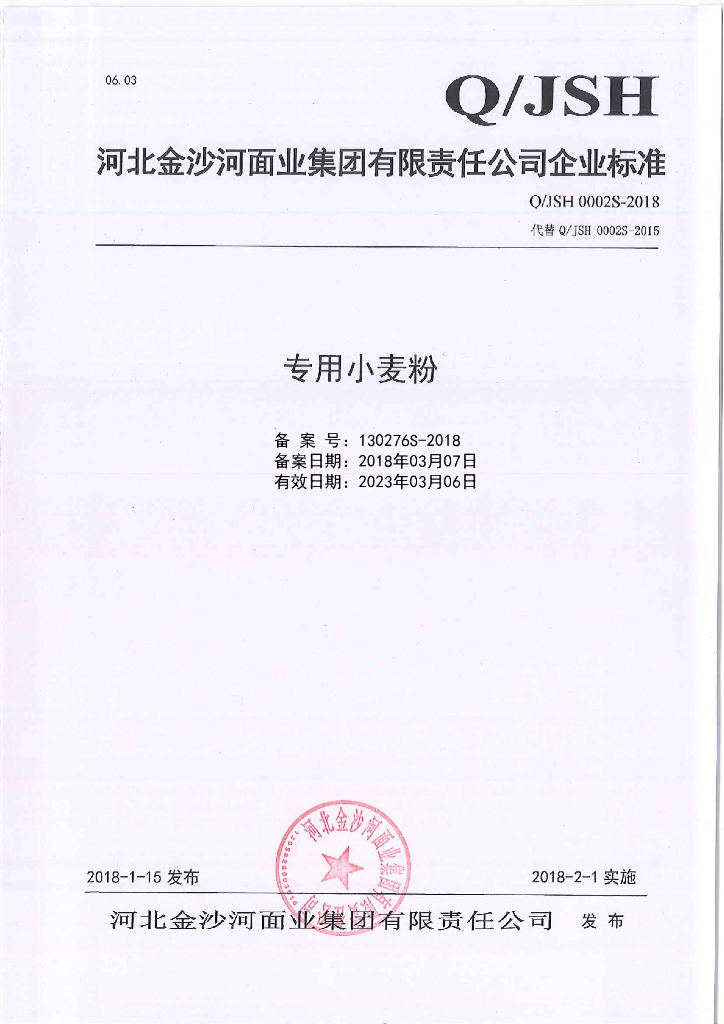 Q/JSH 0002S-2018 专用小麦粉