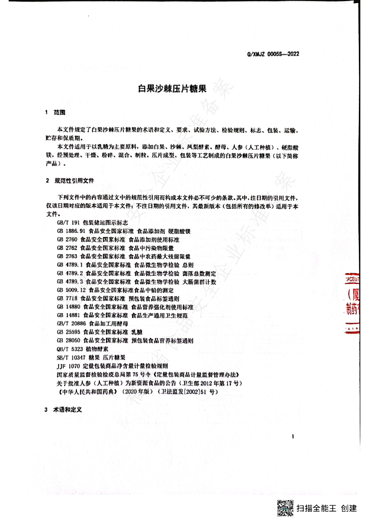 Q/XMJZ 0005S-2022 白果沙棘压片糖果