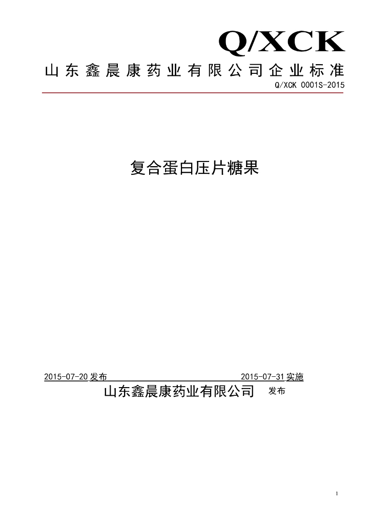 Q/XCK 0001S-2015 山东鑫晨康药业有限公司 复合蛋白压片糖果