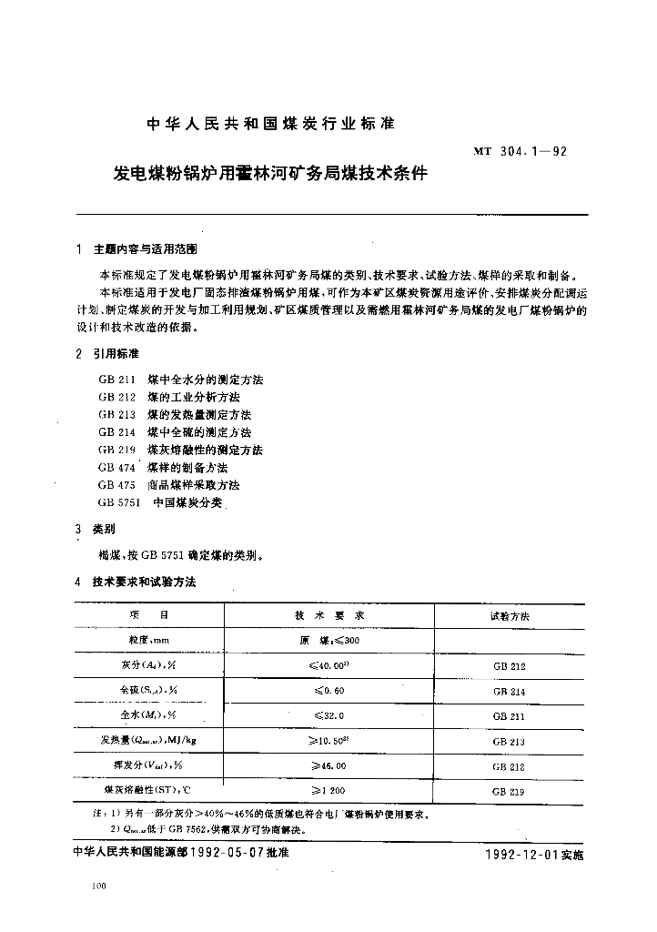 MT 304.1-1992 发电煤粉锅炉用霍林河矿务局煤技术条件