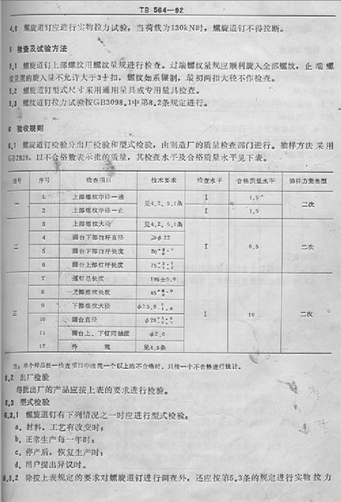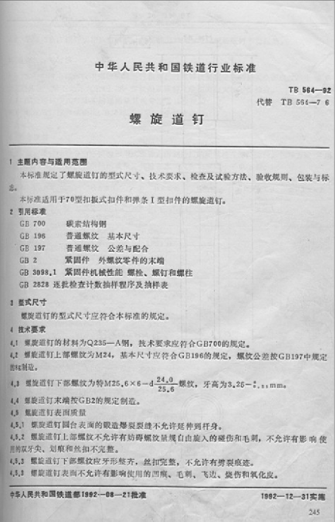 TB 564-1992 螺旋道钉