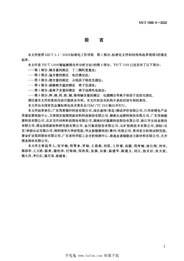 广东邦普循环科技有限公司、国合通用(青岛)测试评价有限公司、江西省锂电产品质量监督检验中心、天津国安盟固利新材料科技股份有限公司、湖南长远锂科股份有限公司、广东佳纳能源科技有限公司、北京当升材料科技股份有限公司、湖南杉杉能源科技股份有限公司、浙江华友钴业股份有限公司、清远佳致新材料研究院有限公司、金川集团股份有限公司、北矿检测技术有限公司、国标(北京)检验认证有限公司、深圳清华大学研究院、华友新能源科技(衢州)有限公司、贵州省分析测试研究院、紫金矿业集团股份有限公司、广东省科学院工业分析检测中心、南通金通