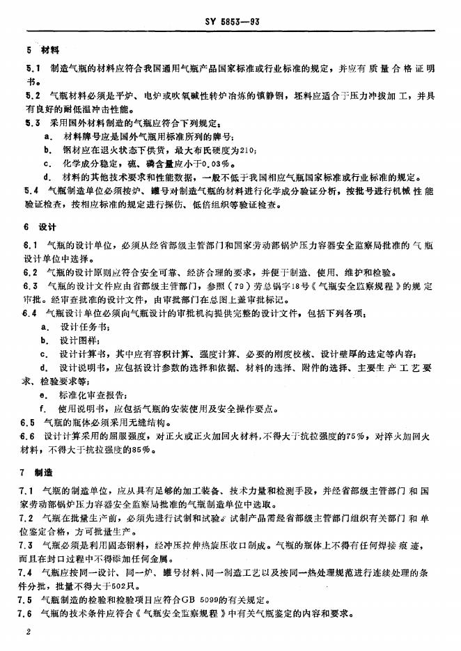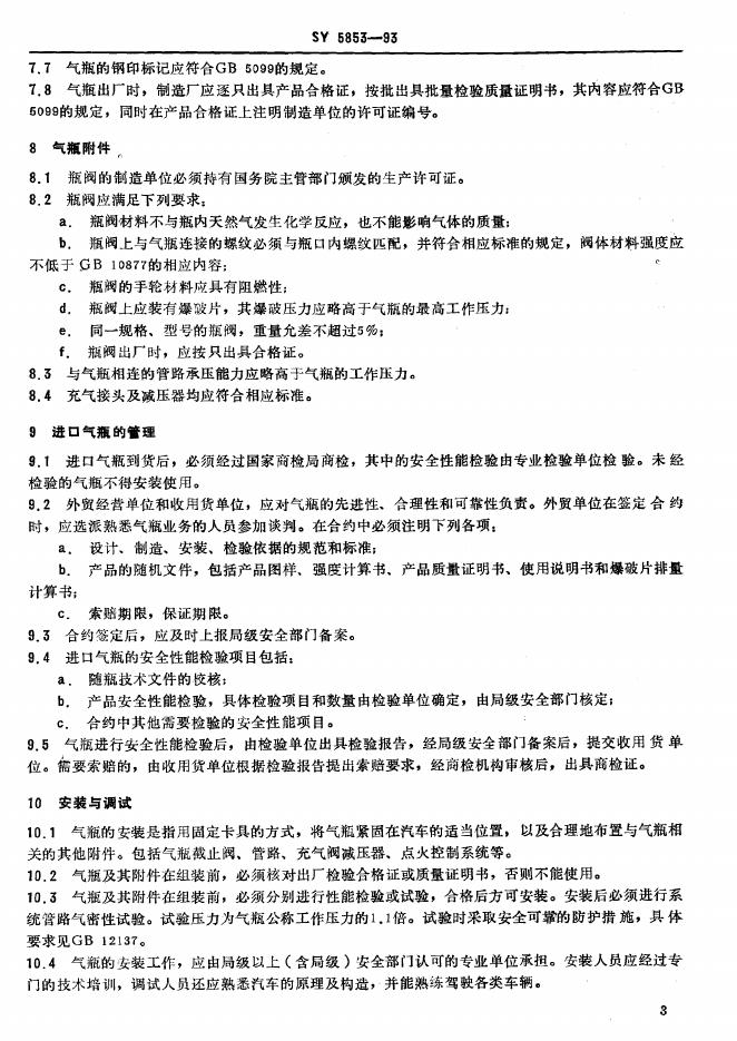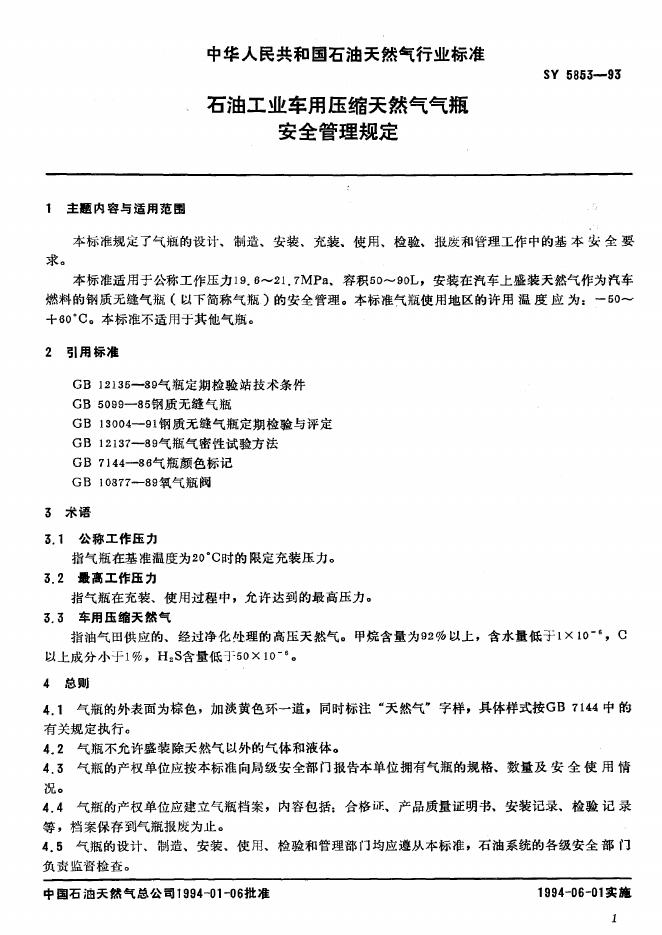 SY 5853-1993 石油工业车用压缩天然气瓶安全管理规定