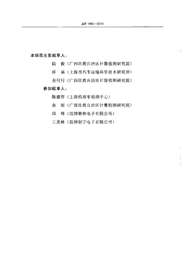 陆俊(广西壮族自治区计量检测研究院)、许基(上海市汽车运输科学技术研究所)、全付付(广西壮族自治区计量检测研究院)、陈建萍(上海机动车检测中心)、余挺(广西壮族自治区计量检测研究院)、邱峰(淄博赛格电子有限公司)、王茂林(淄博创宇电子有限公司)