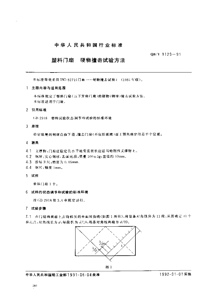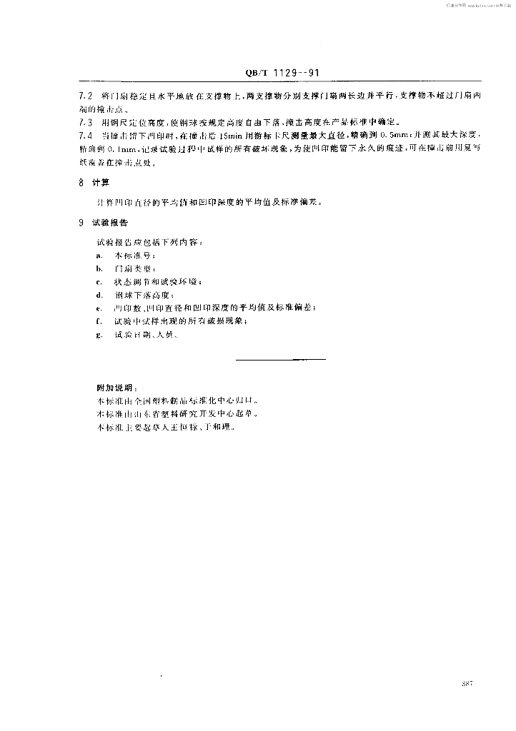 QB/T 1129-1991 塑料门扇硬物撞击试验方法