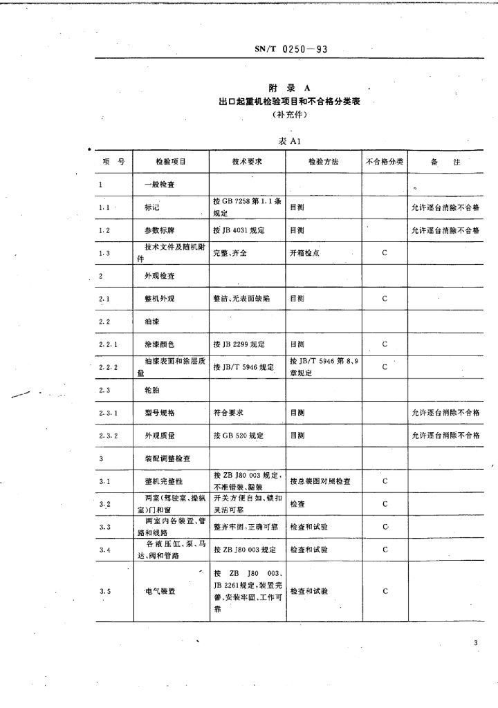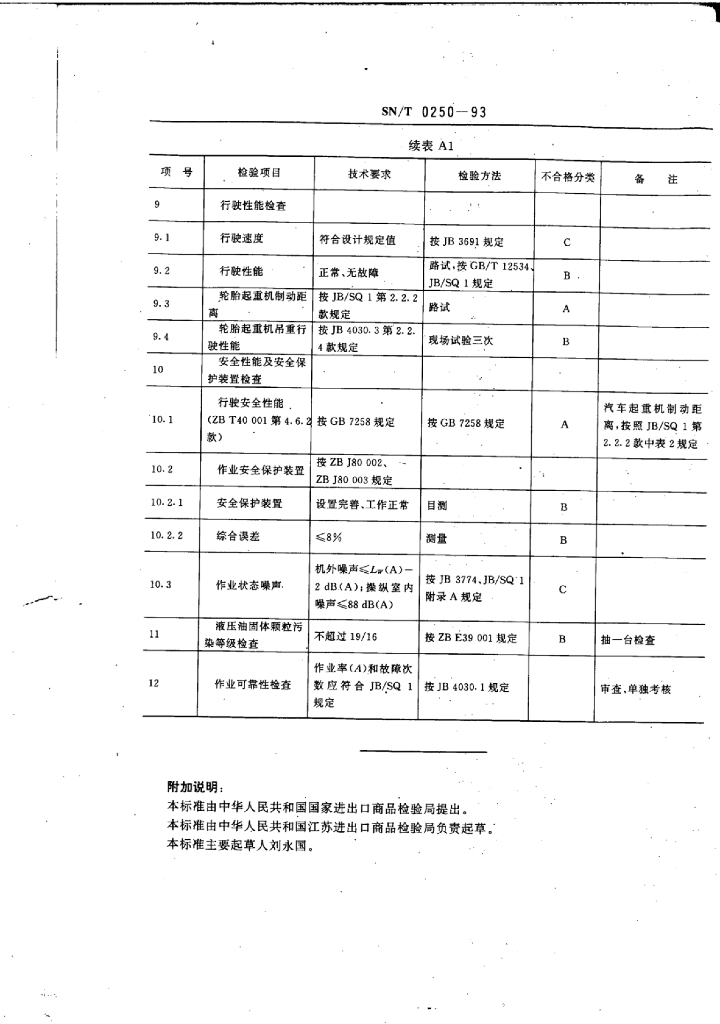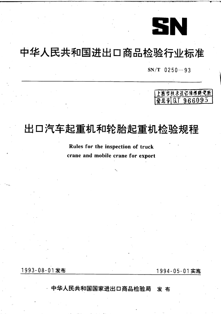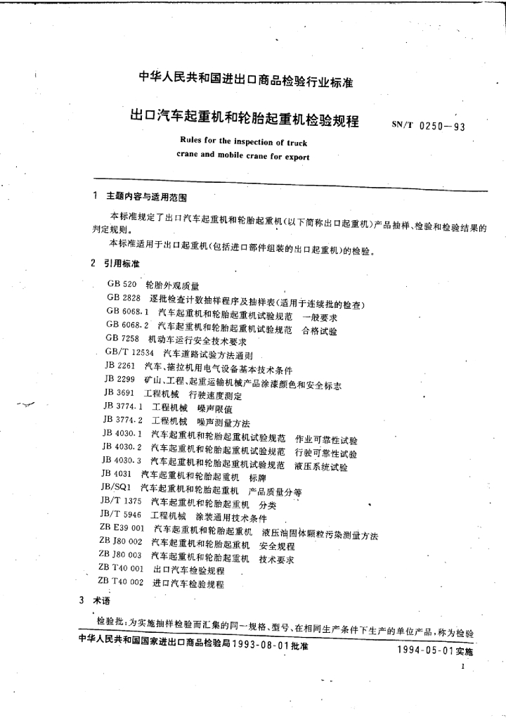SN/T 0250-1993 出口汽车起重机和轮胎起重机检验规程