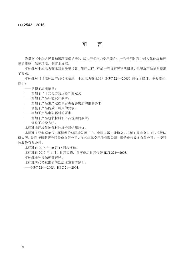 HJ 2543-2016 环境标志产品技术要求 干式电力变压器