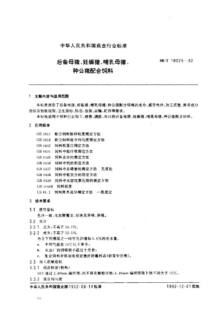 SB/T 10075-1992 后备母猪、妊娠猪、哺乳母猪、种公猪配合饲料(LS/T3401-1992)