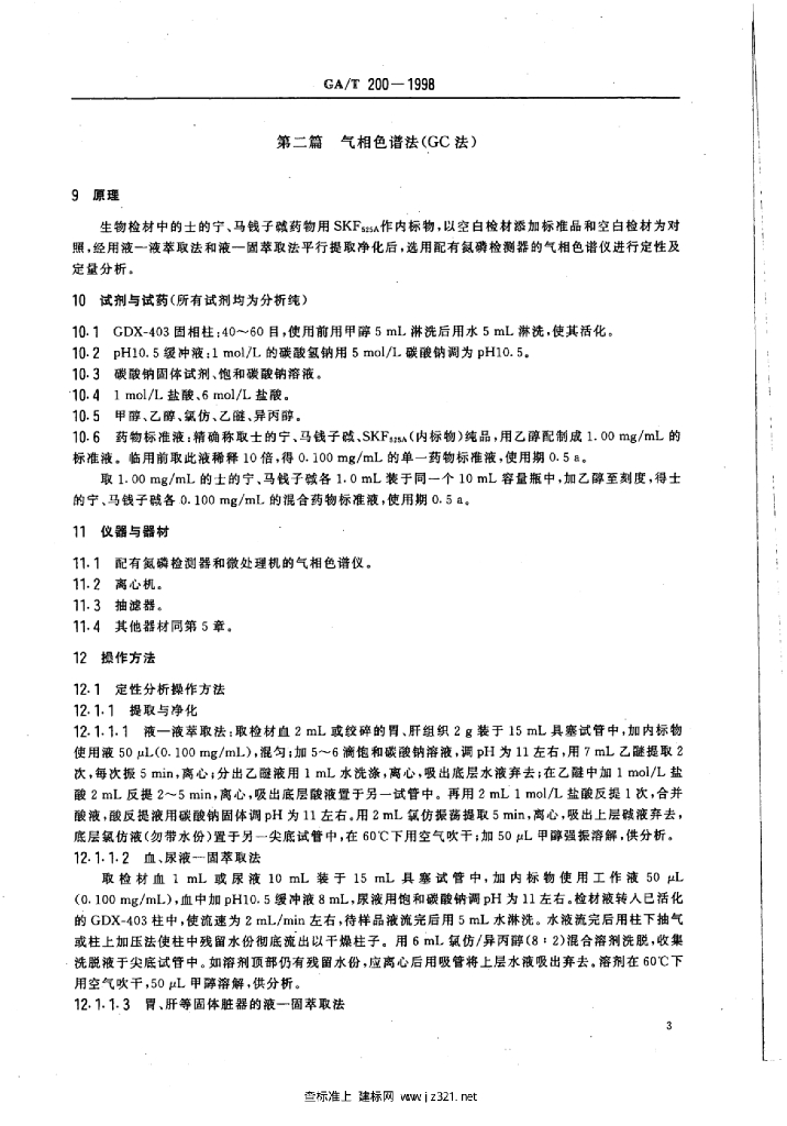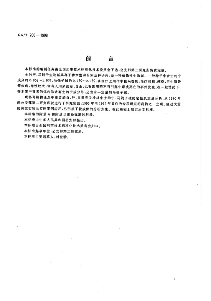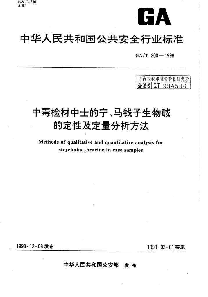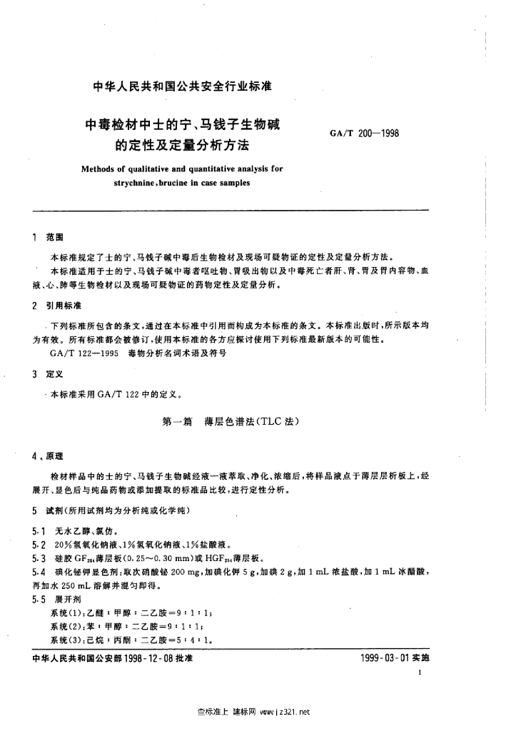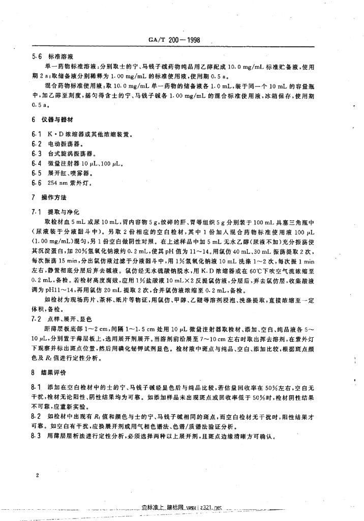 GA/T 200-1998 中毒检材中士的宁、马钱子生物碱的定性及定量分析方法