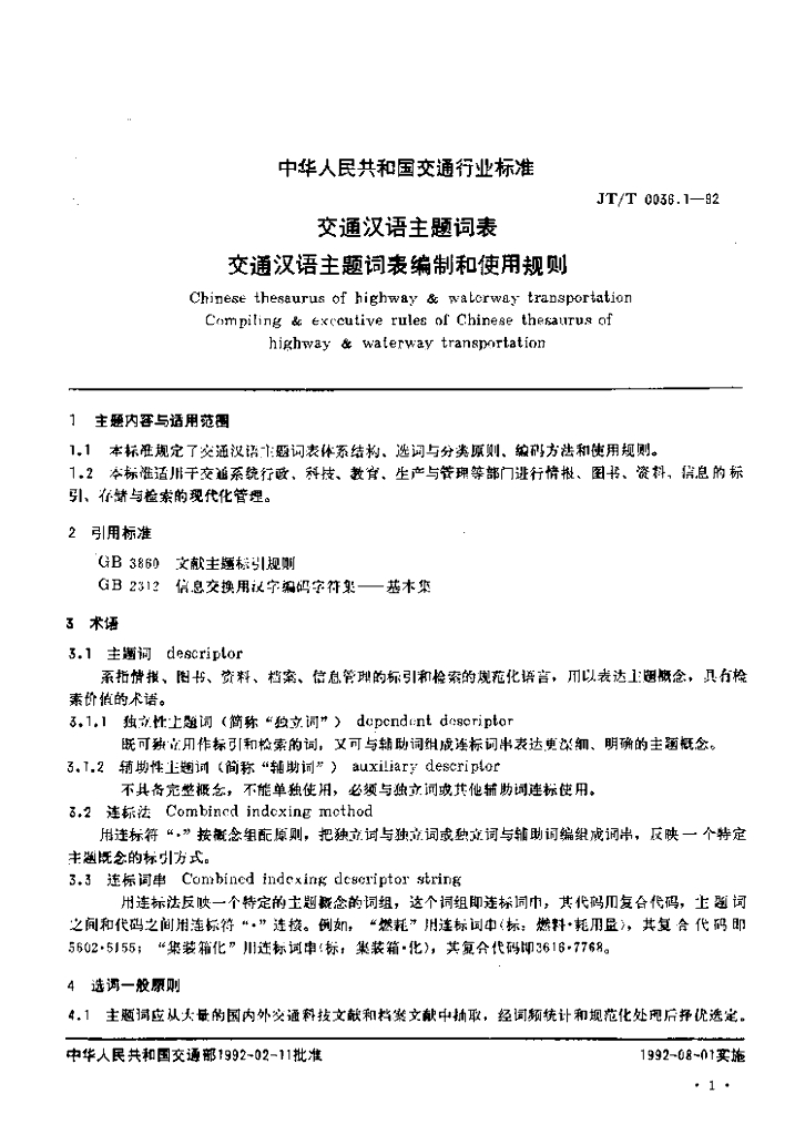 JT/T 0036.1-1992 交通汉语主题词表交通汉语主题词表编制和使用规则