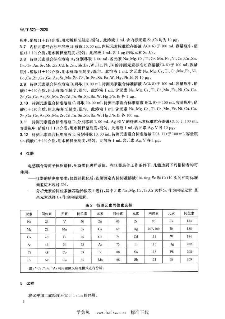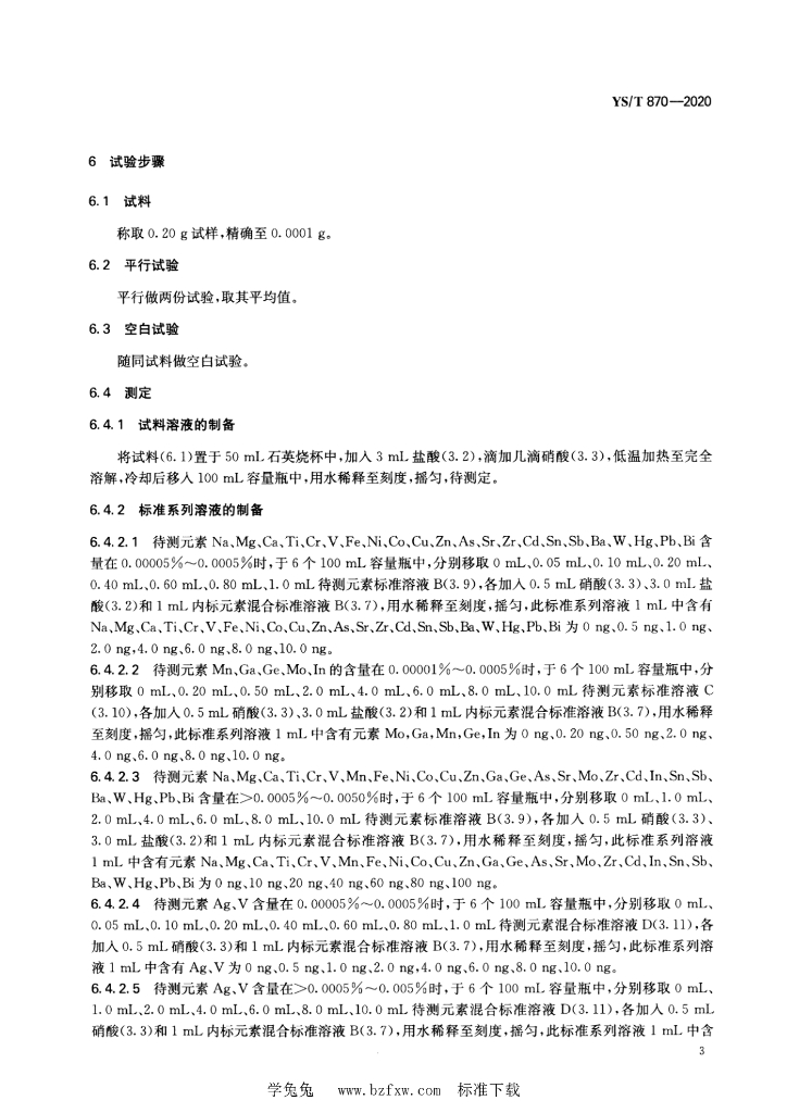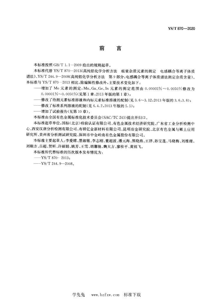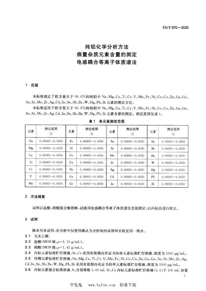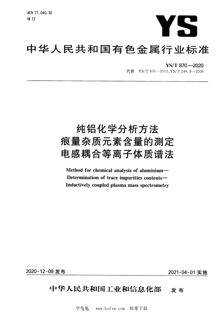 YS/T 870-2020 纯铝化学分析方法 痕量杂质元素含量的测定 电感耦合等离子体质谱法