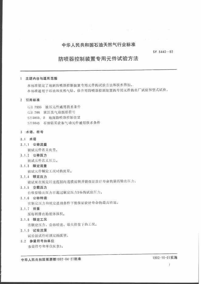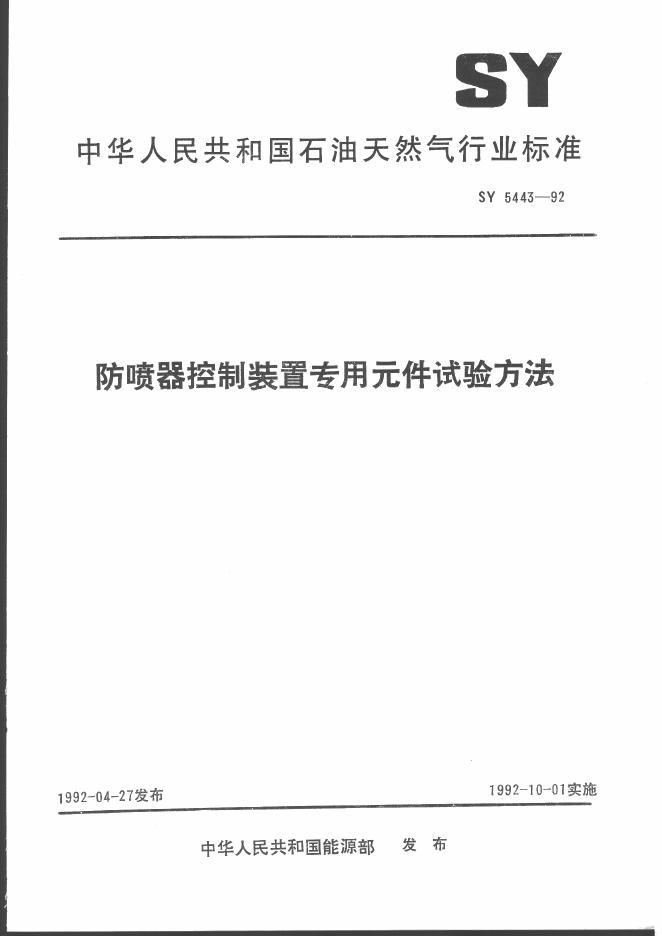 SY 5443-1992 防喷器控制装置专用元件试验方法