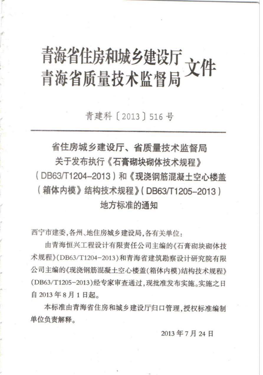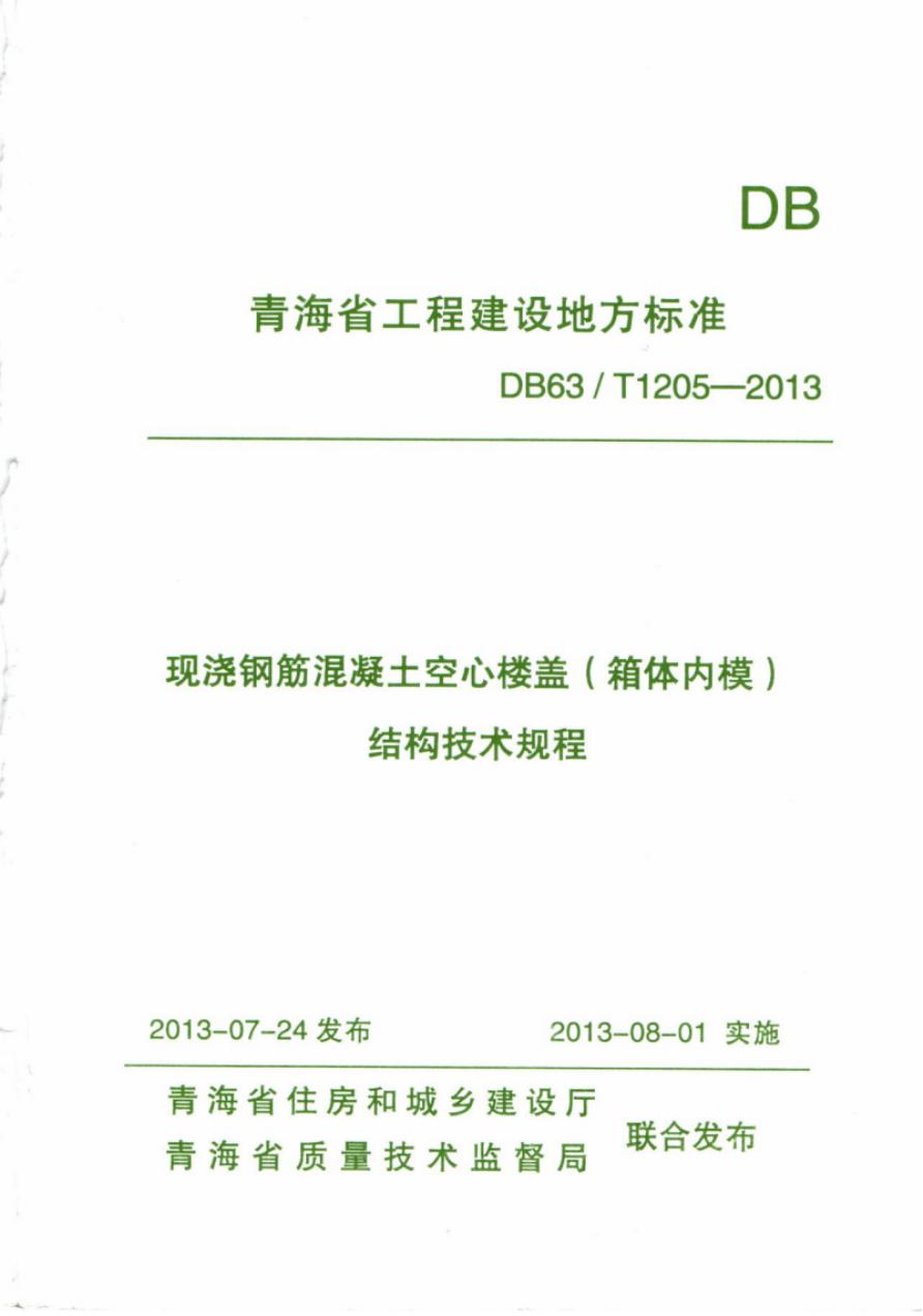 DB63/T 1205-2013 现浇钢筋混凝土空心楼盖(箱体内模)结构技术规程
