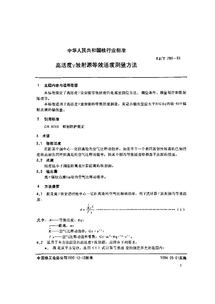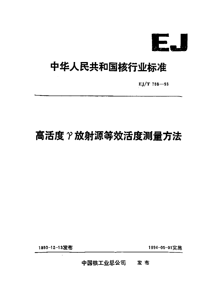 EJ/T 788-1993 高活度γ放射源等效活度测量方法