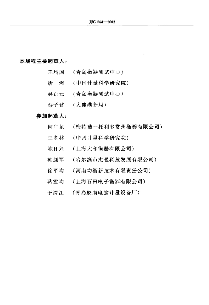 王均国(青岛衡器测试中心)、唐煜(中国计量科学研究院)、吴正元(青岛衡器测试中心)、秦子君(大连港务局)、何广龙(梅特勒一托利多常州衡器有限公司)、王孝林(中国计量科学研究院)、陈日兴(上海大和衡器有限公司)、韩剑军(哈尔滨市杰曼科技发展有限公司)、徐平均(河南均衡新技术有限责任公司)、蒋雪均(上海石田电子衡器有限公司)、于清江(青岛胶南电脑计量设备厂)