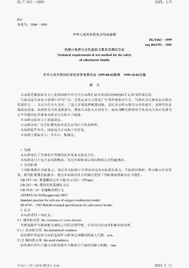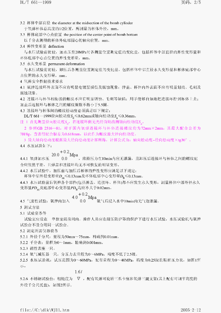 DL/T 661-1999 热量计氧弹安全性能技术要求及测试方法