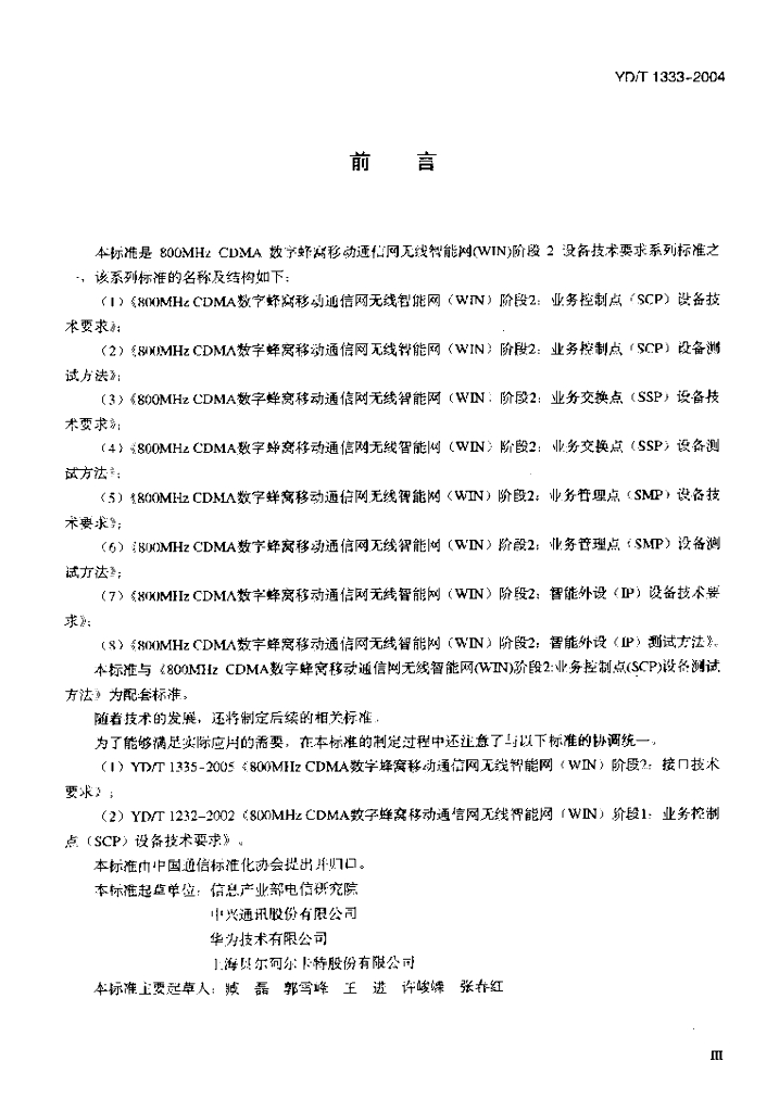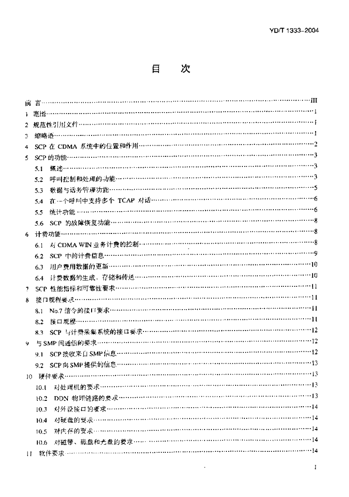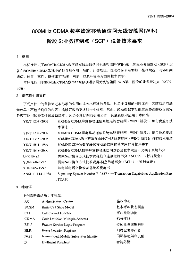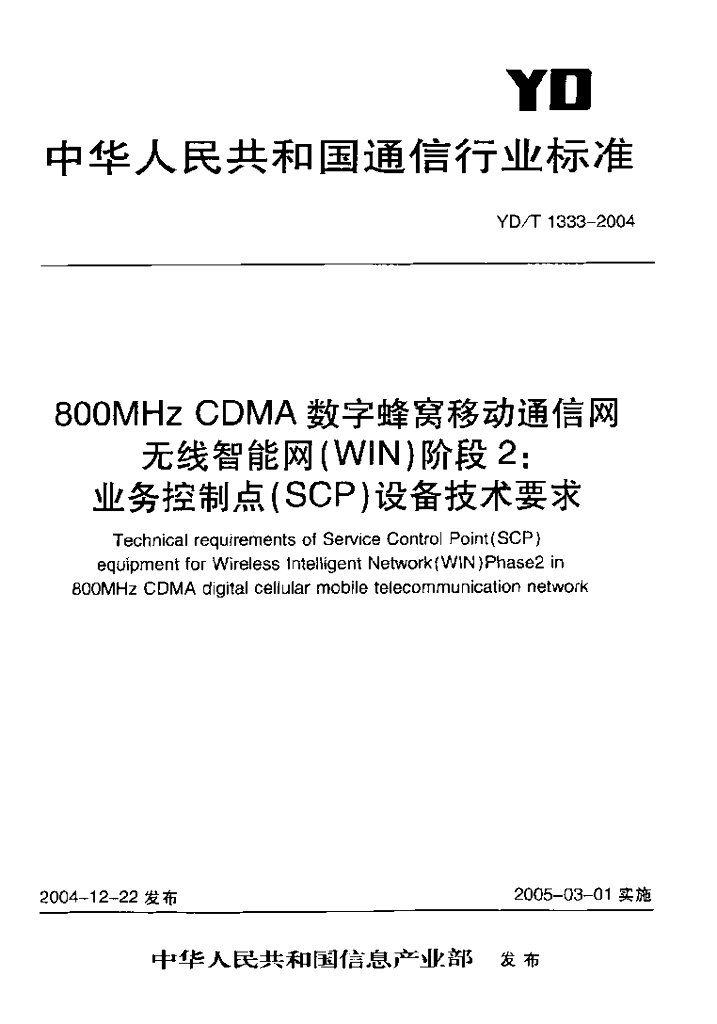 YD/T 1333-2004 800MHz CDMA 数字蜂窝移动通信网无线智能网(WIN)阶段2:业务控制点(SCP)设备技术要求