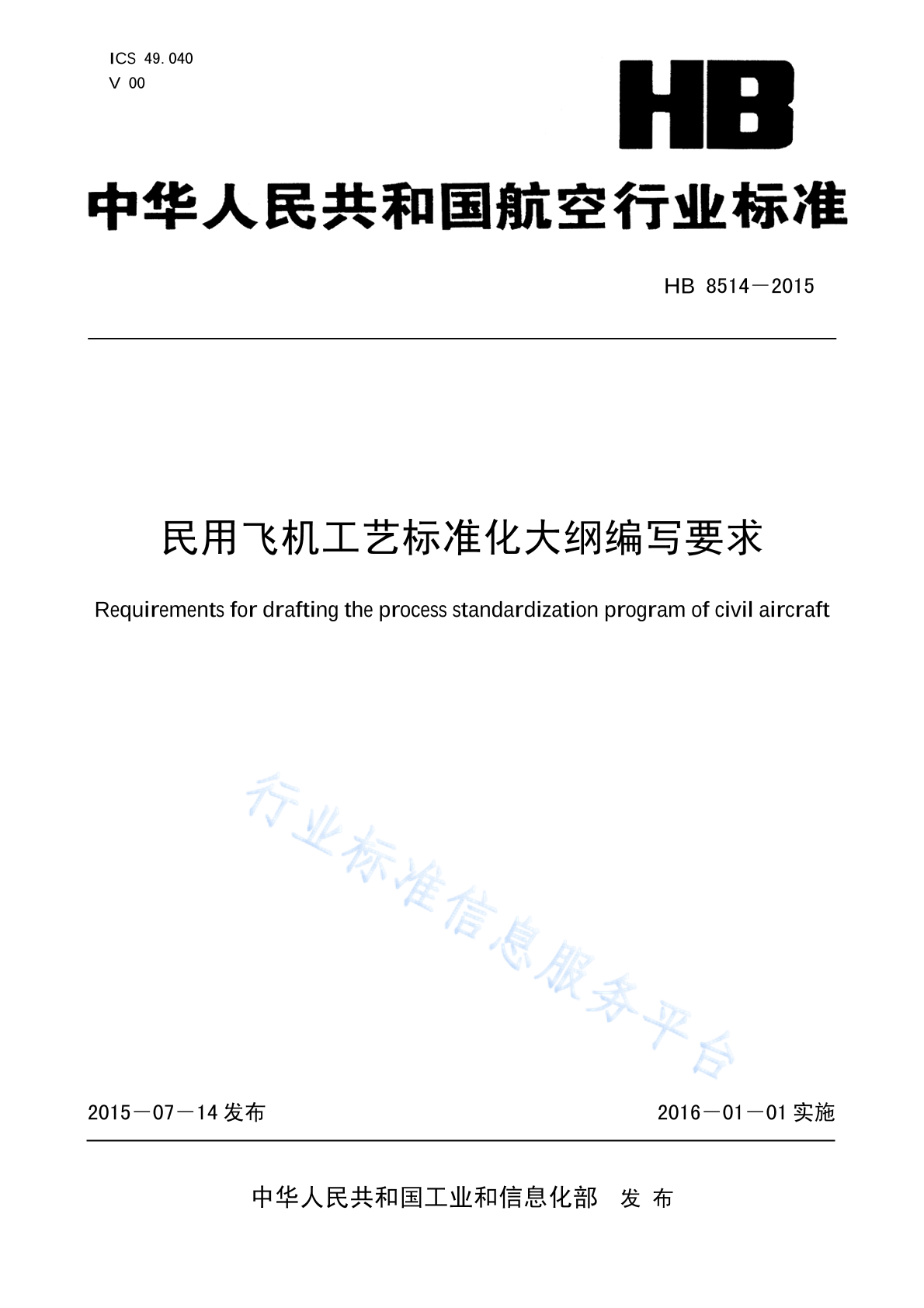 HB 8514-2015 民用飞机工艺标准化大纲编写要求(2017)