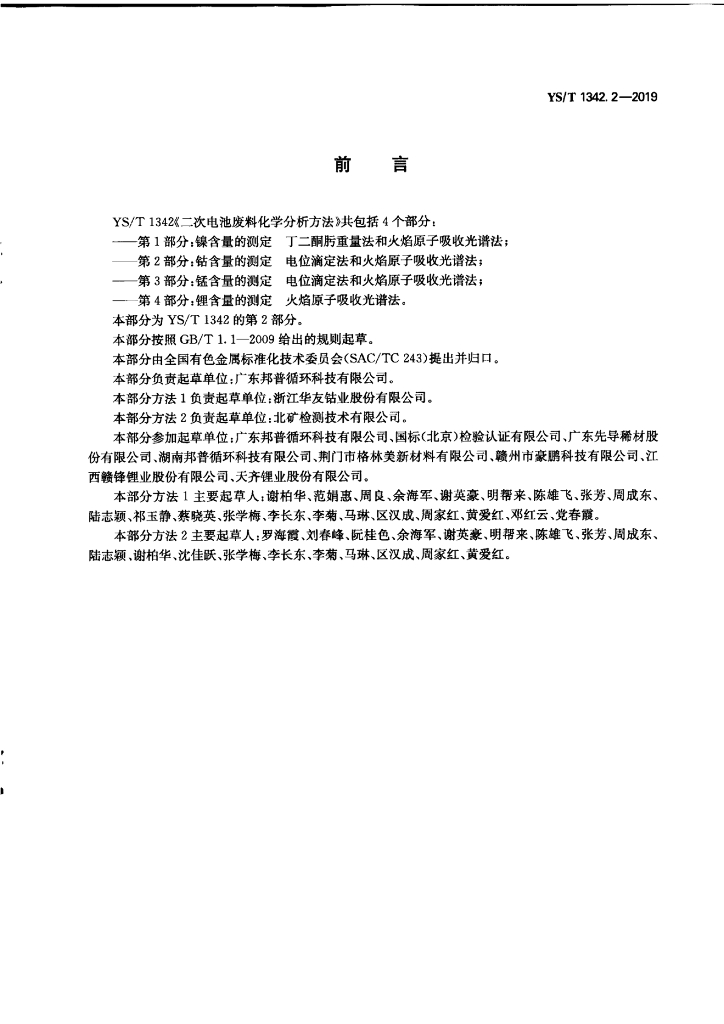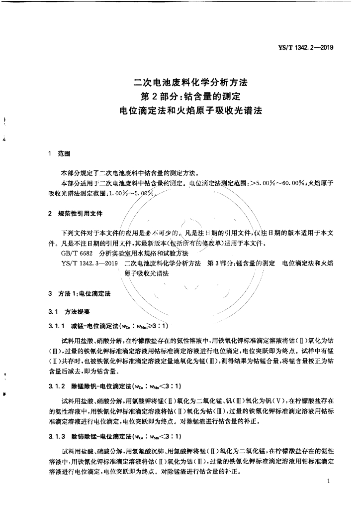 YS/T 1342.2-2019 二次电池废料化学分析方法 第2部分:钴含量的测定 电位滴定法和火焰原子吸收光谱法