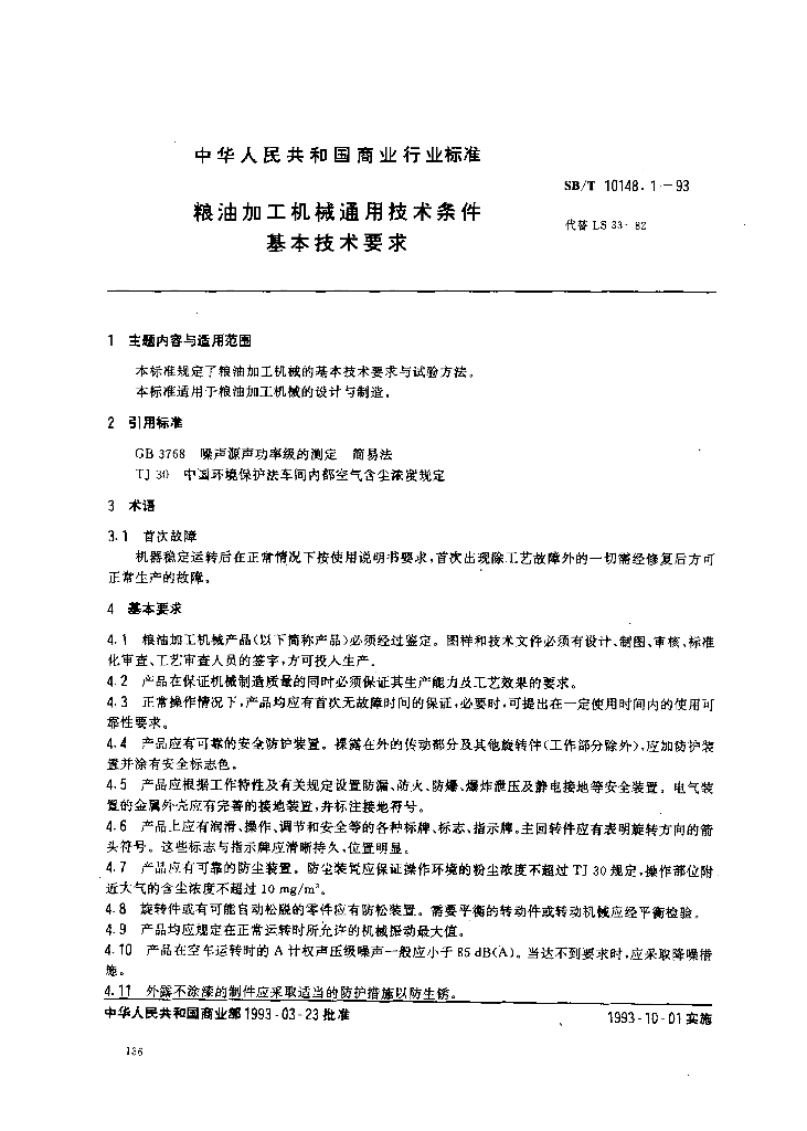SB/T 10148.1-1993 粮油加工机械通用技术条件 基本技术要求(LS/T 3501.1-1993)