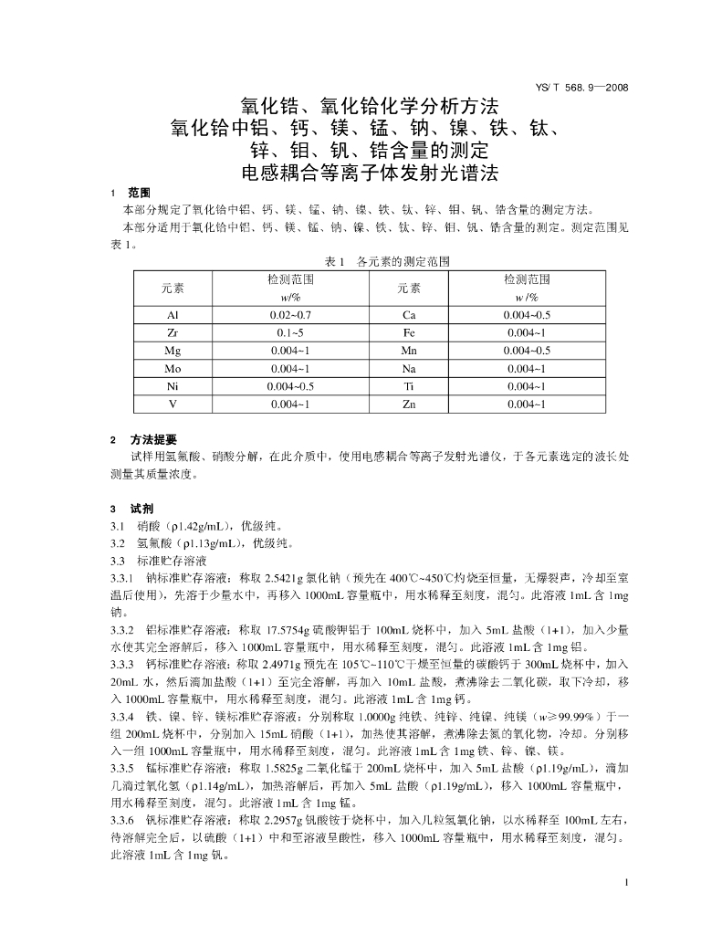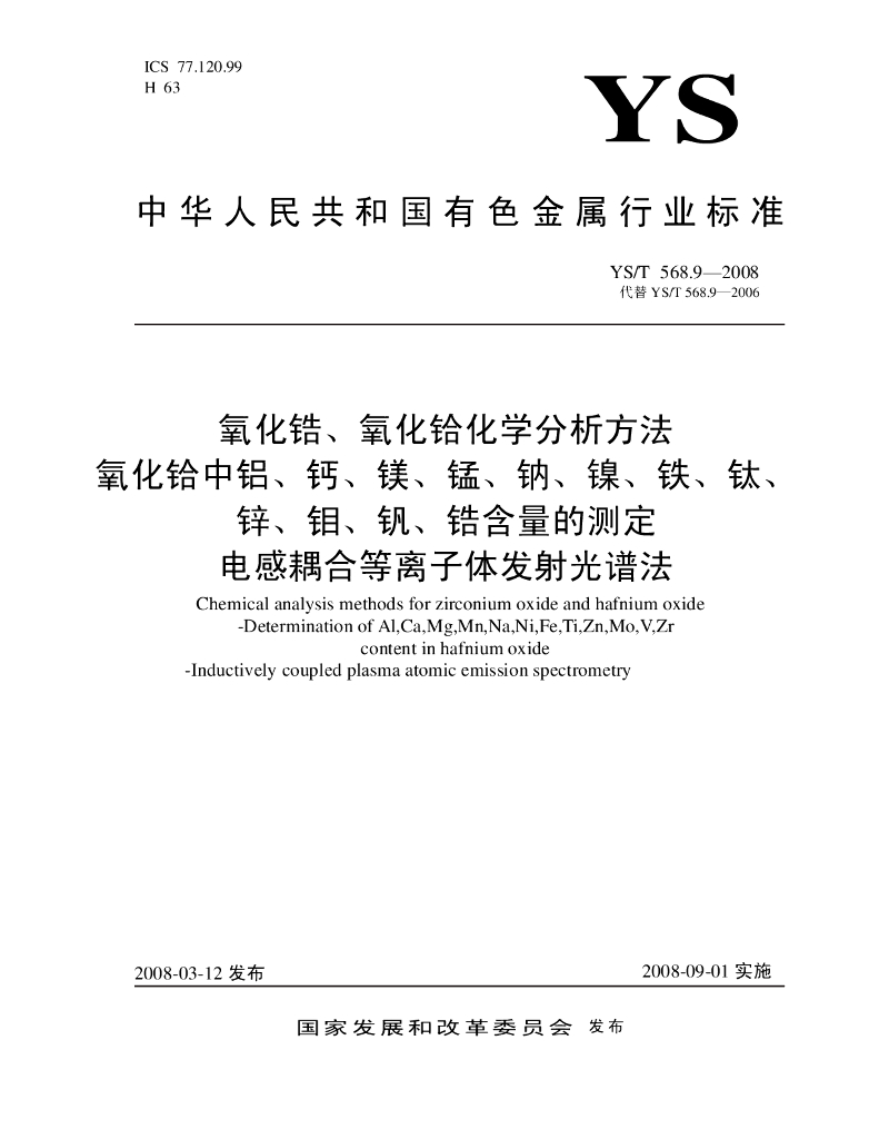 YS/T 568.9-2008 氧化锆、氧化铪化学分析方法 氧化铪中铝、钙、镁、锰、钠、镍、铁、钛、锌、钼、钒、锆含量的测定 电感耦合等离子体发射光谱法