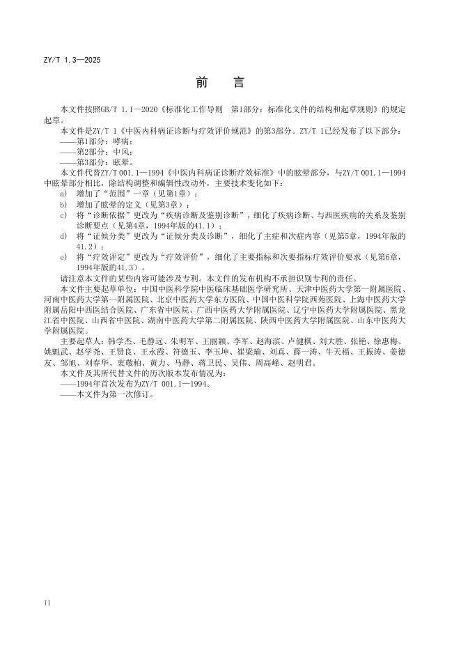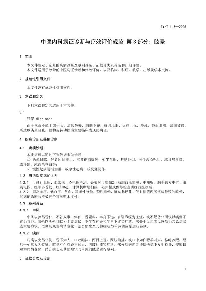 ZY/T 1.3-2025 中医内科病证诊断与疗效评价规范 第3部分:眩晕