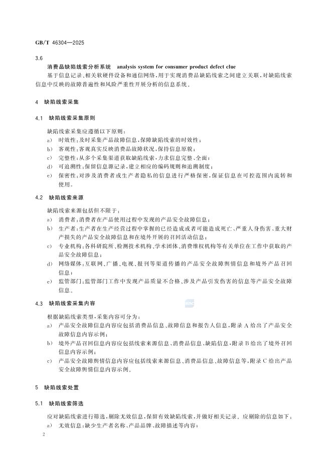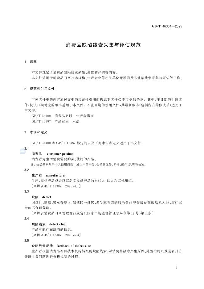 GB/T 46304-2025 消费品缺陷线索采集与评估规范