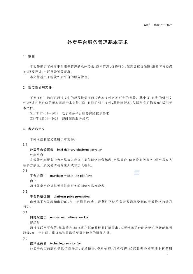 GB/T 46862-2025 外卖平台服务管理基本要求
