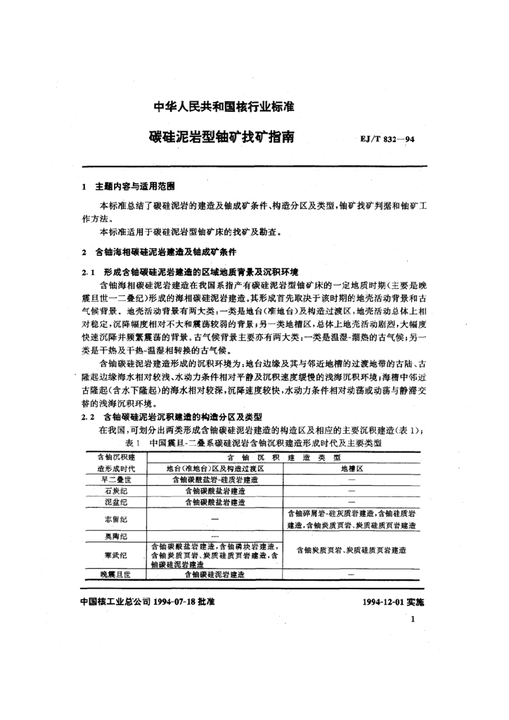 EJ/T 832-1994 碳硅泥岩型铀矿找矿指南